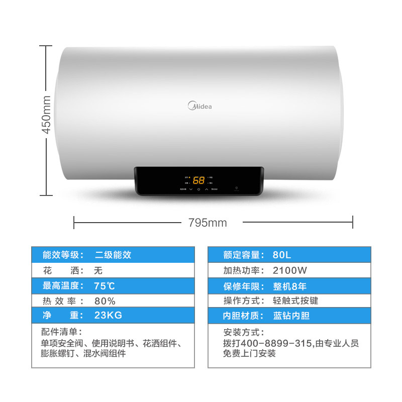 商品名稱:Midea/美的 F6021-X1(S)熱水器儲水式 家用洗澡電熱水器抑菌節能 直降150 購買送淨水器+花灑套裝
